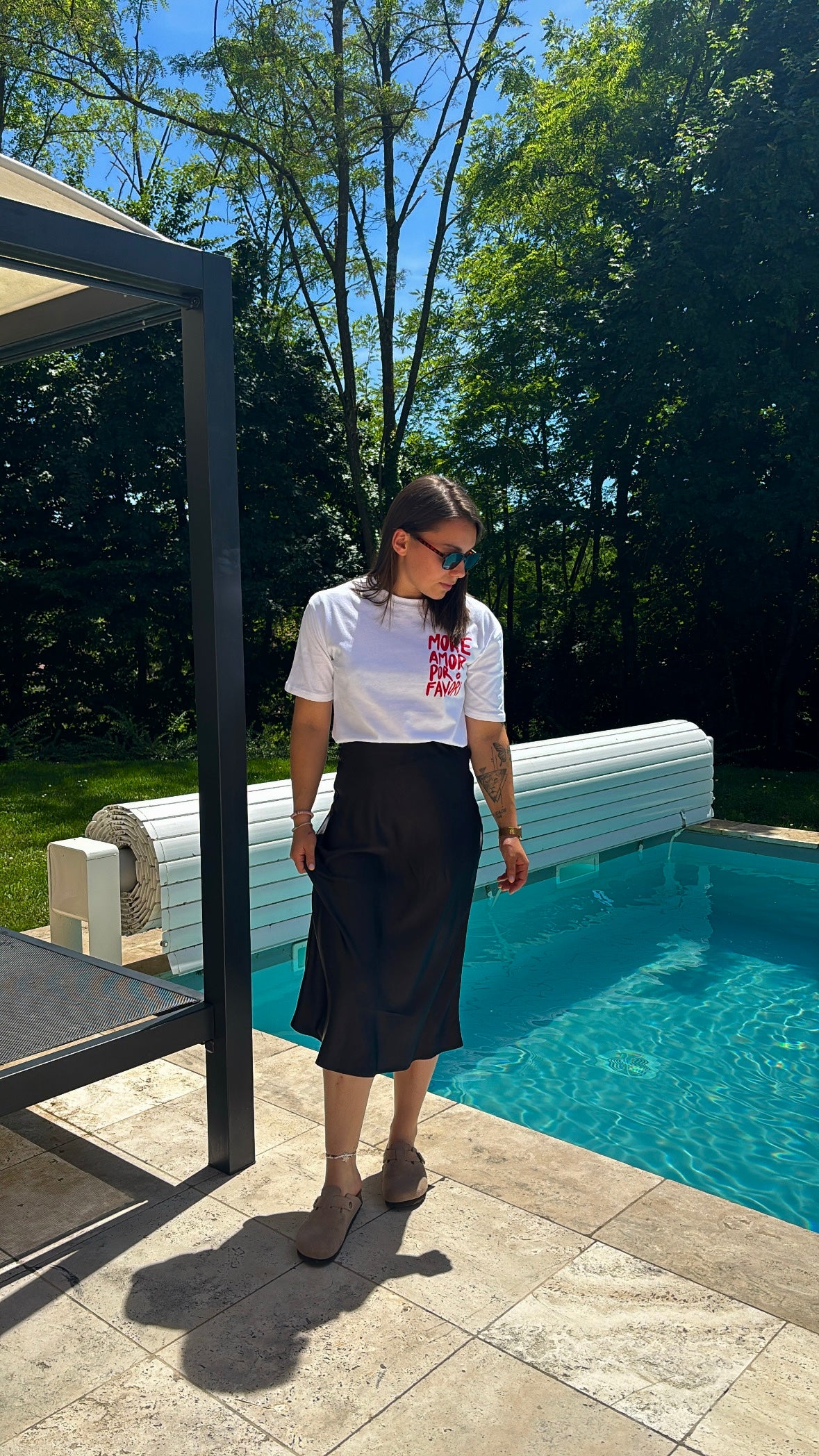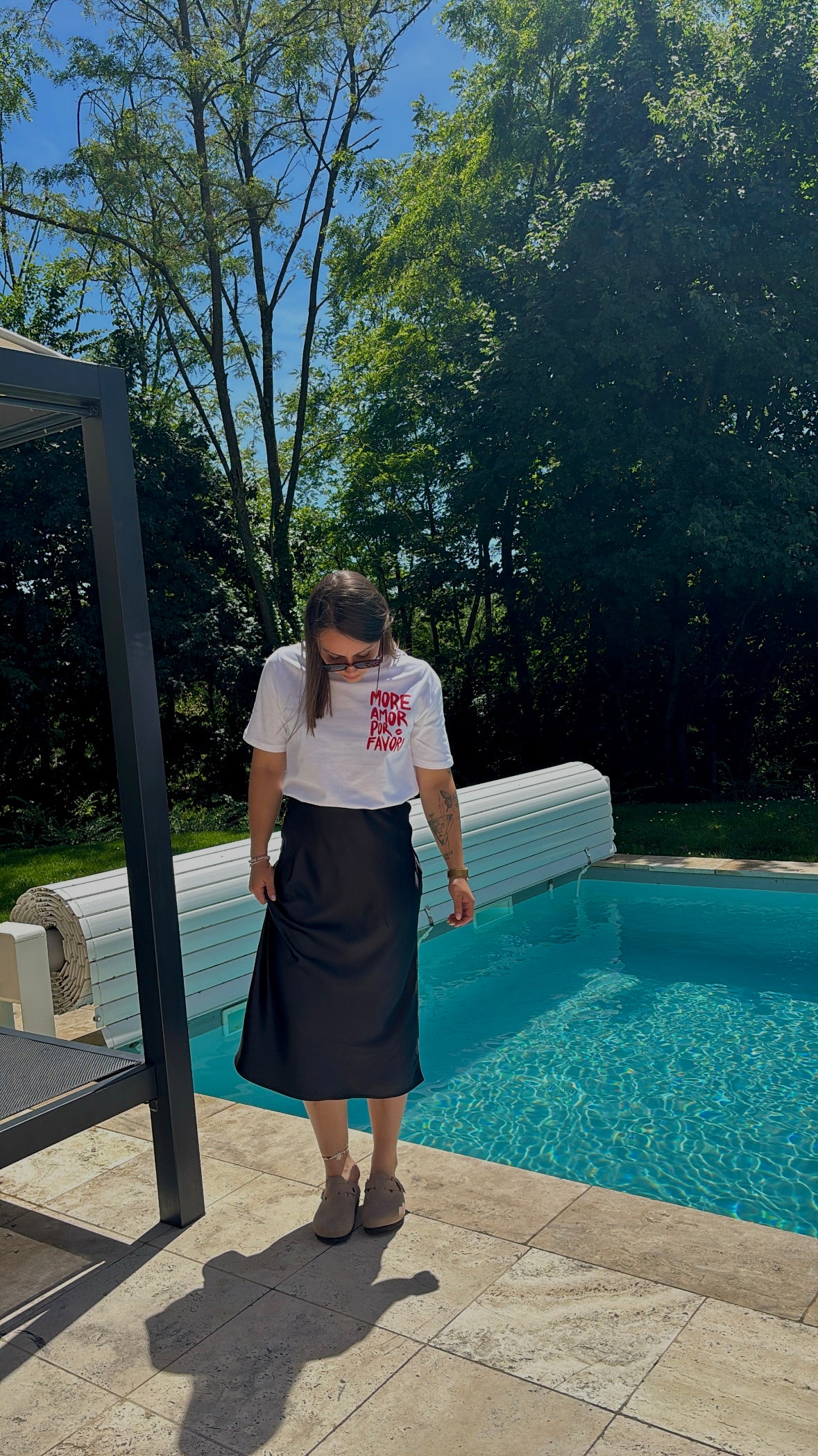 Avec sa matière satinée à la brillance subtile, cette jupe incarne l’élégance en mouvement. Sa coupe fluide suit naturellement les courbes, tandis que sa taille haute allonge la silhouette.